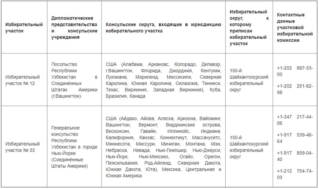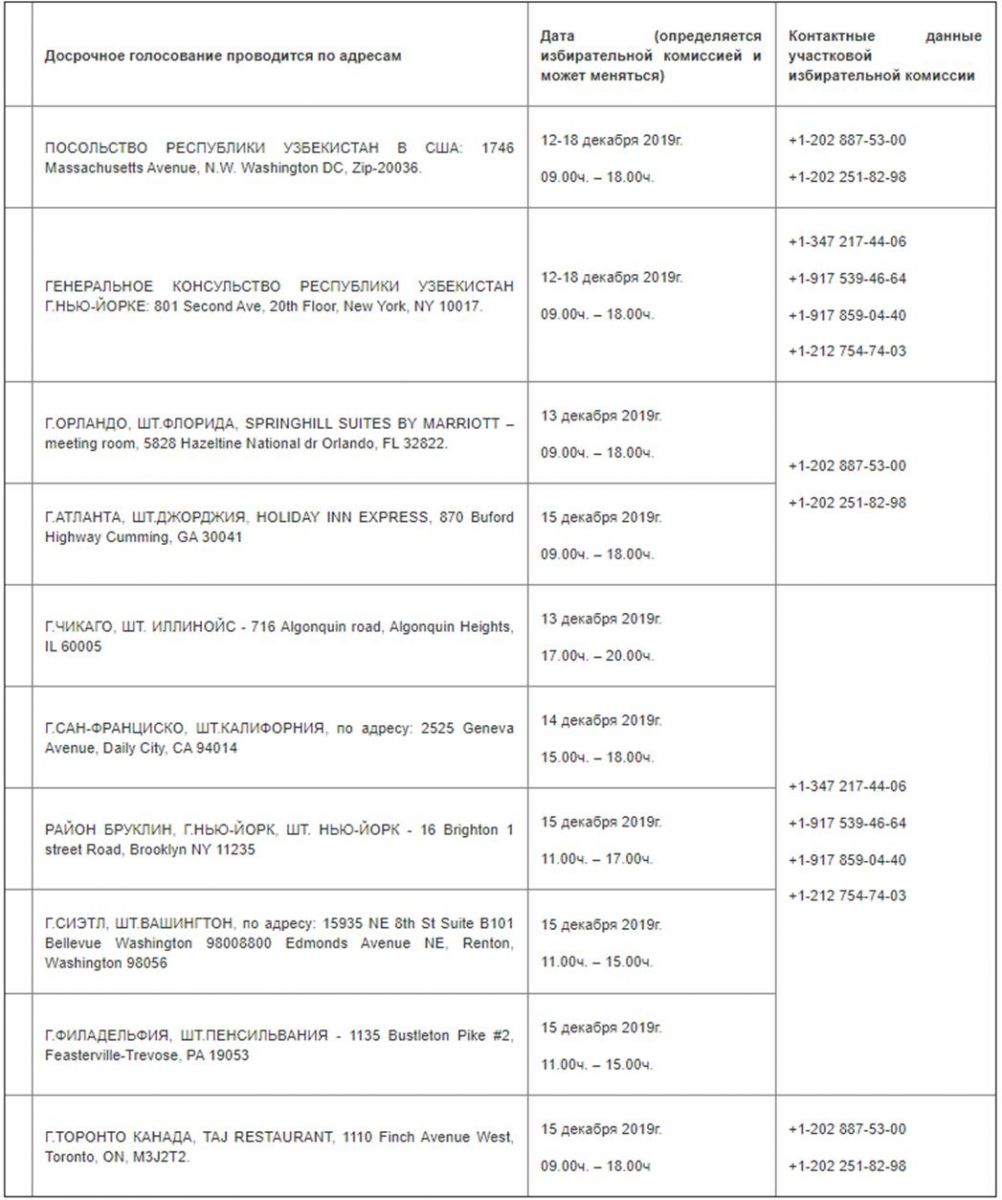 По информации Посольства Узбекистана в США, Постоянного представительства при ООН и Генерального консульства в г.Нью-Йорке, 22 декабря 2019 года граждане Узбекистана, находящиеся на территории США, Канады, Центральной и Южной Америки, смогут проголосовать на парламентских выборах на избирательных участках № 12 (Вашингтон) и № 33 (Нью-Йорк).
