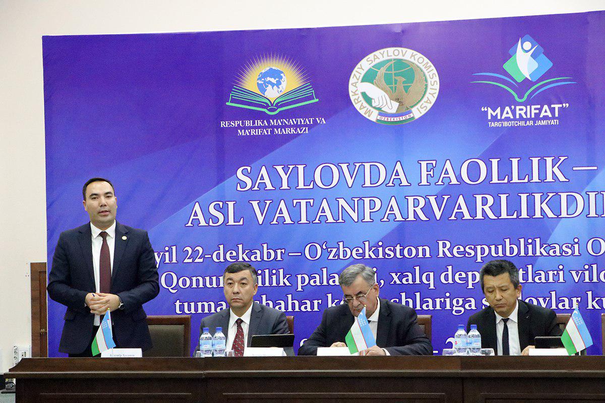 1 ноября 2019 года, в Ташкенте был проведен семинар, организованный Республиканским центром духовности и просветительства, обществом пропагандистов "Маърифат" совместно с Центральной избирательной комиссией, на тему "Активность в выборах истинный патриотизм".