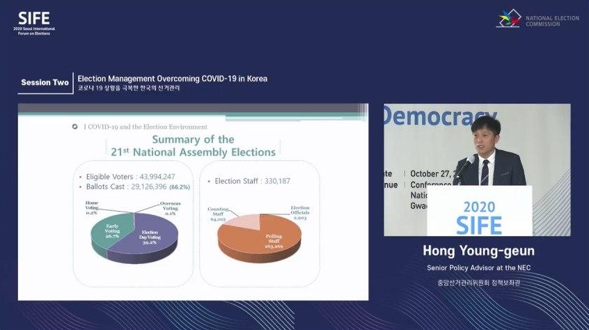 “COVID-19 билан курашиш жараёнида сайловларни бошқариш бўйича Корея тақдимоти” мавзусига бағишланган иккинчи сессияда    2020 йил апрель ойида Корея Республикасининг 21-чақириқ Миллий мажлисига ўтказилган сайловларга тўхталиб ўтилди. Ушбу сайловлар ЖССТ томонидан COVID-19 пандемияси эълон қилингандан сўнг ўтказилган биринчи умуммиллий сайловлар сифатида қайд этилган эди. Мазкур сайловдан орттирилган тажрибаларни пандемия шароитида сайлов ўтказадиган бошқа давлатлар намуна сифатида фойдаланишлари мумкинлиги айтиб ўтилди.