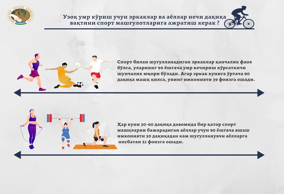 Аёлларнинг эса жисмоний машқларни бажариш вақти бир соатдан ортиқ давом этмасагина, улар учун фойдали бўлар экан. Шундай қилиб, ҳар куни 30-60 дақиқа давомида бир қатор спорт машқларни бажарадиган аёллар учун 90 ёшгача яшаш имконияти 30 дақиқадан кам шуғулланувчи аёлларга нисбатан 21 фоизга ошади.