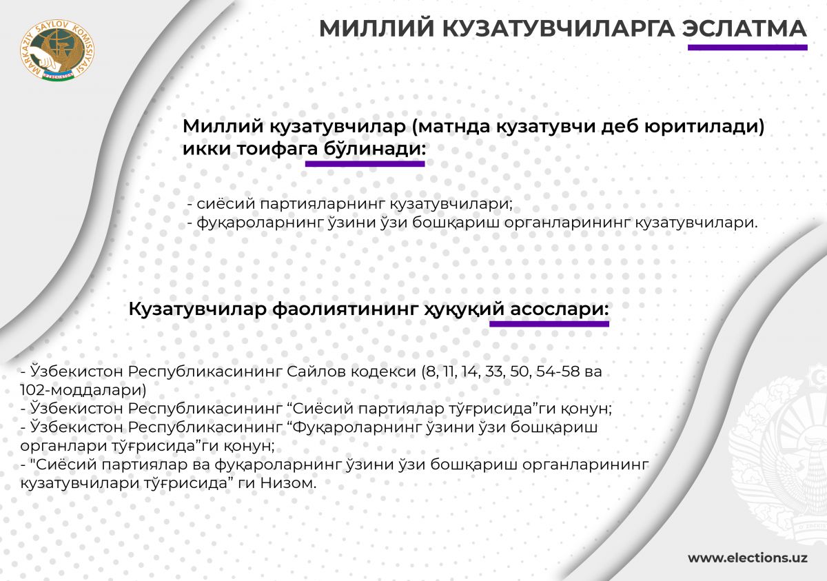 сайлов тўғрисидаги қонунчилик ҳужжатлари ҳақида ҳамда сайловга тайёргарлик кўриш ва унинг ўтказилиши бўйича ўз фикрини баён қилиш ҳуқуқига эга.
