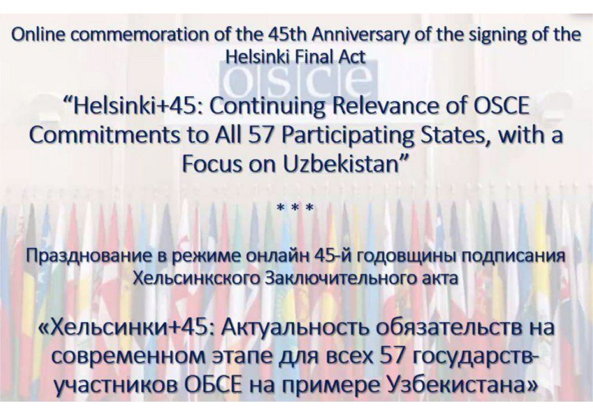 28 августа в г.Ташкенте состоялась конференция на тему: «Хельсинки+45: Актуальность обязательств на современном этапе для всех 57 государств-участников ОБСЕ на примере Узбекистана», приуроченная к 45-й годовщине подписания Хельсинкского Заключительного акта.