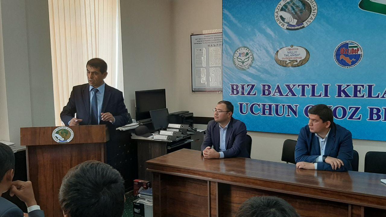 Йиғилишда Марказий сайлов комиссияси эксперти Сарвар Ибодуллаев сайловчиларининг ягона электрон рўйхатини шакллантириш ва сайлов жараёнларида қонун бузилиши ҳолатлари учун жавобгарлик тўғрисида маълумот бериб ўтди. Сайлов қонунчилигида кўплаб қоидалар мавжуд бўлиб, шулардан бири бу фуқароларнинг сайлов ҳуқуқлари бузилгани юзасидан шикоят қилиш ҳуқуқидир. Сайлов кодексига мувофиқ, фуқаролар сайлов комиссияларининг қарорлари, ҳаракат (ҳаракатсизлиги) устидан шикоят келтиришлари мумкин.