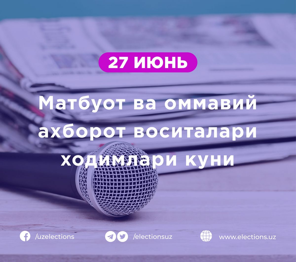 Ўзбекистон Республикаси Марказий сайлов комиссияси мамлакатимиздаги барча оммавий ахборот воситалари ходимларини касб байрами -27 июнь – Матбуот ва оммавий ахборот воситалари ходимлари куни билан самимий муборакбод этади.