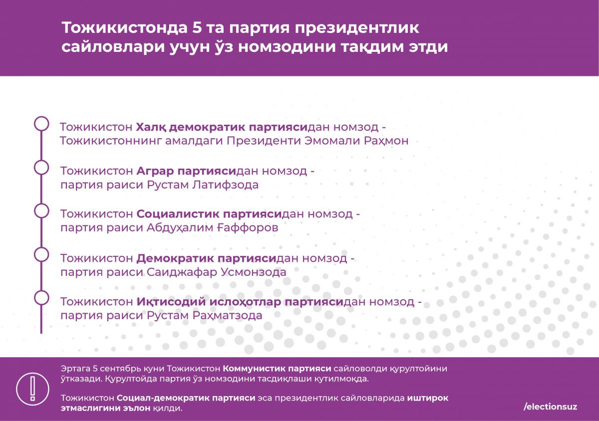 Тожикистон Социал-демократик партияси эса президентлик сайловларида иштирок этмаслигини эълон қилди.