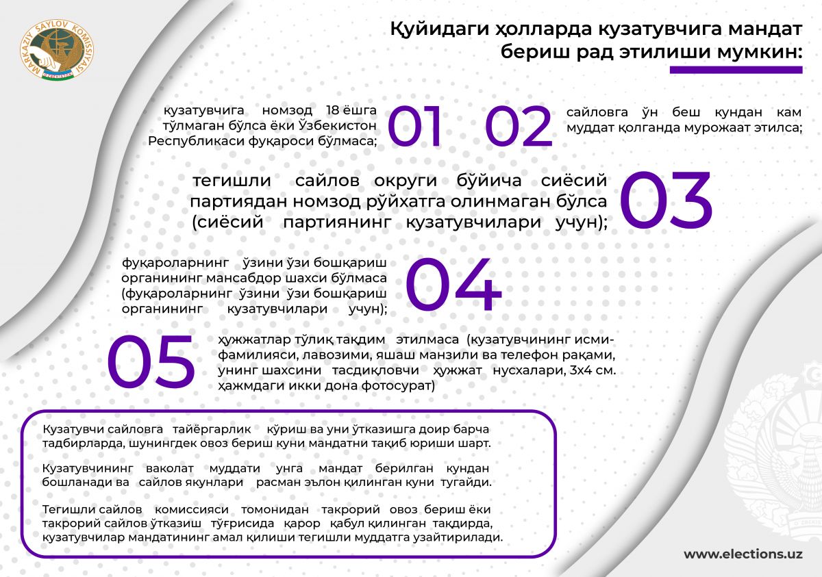 - аккредитация учун тақдим этилган ҳужжатлар Ўзбекистон Республикаси сайловларида хорижий давлатлар ва халқаро ташкилотлардан қатнашадиган кузатувчилар тўғрисидаги низом талабларига жавоб бермаса;