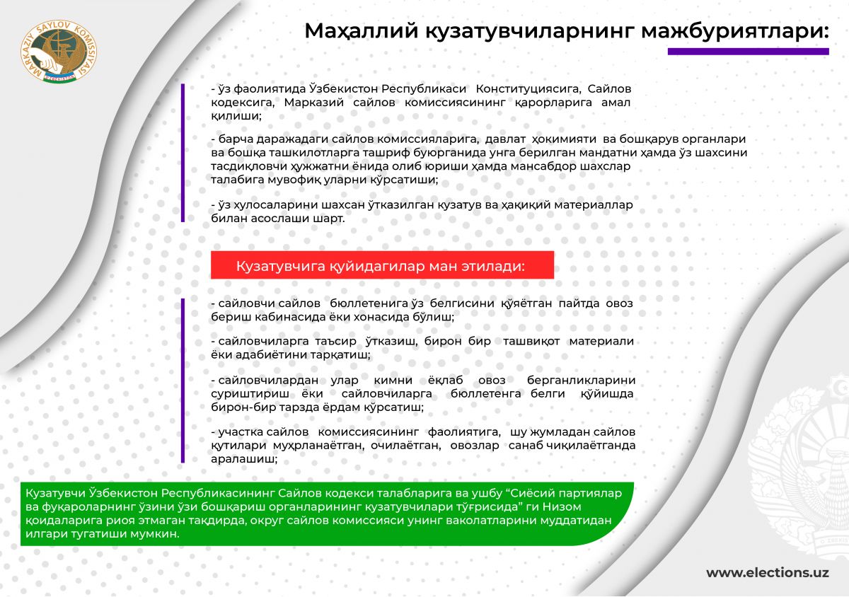 сайлов участкасида ҳозир бўлиш, тайёргарлик ишларининг боришини, яширин овоз бериш кабиналарининг ёки хоналарининг жойлаштирилишини ва сайлов қутиларининг муҳрланишини, фуқароларнинг рўйхатга олинишини, сайлов бюллетенларининг уларга берилишини кузатиш;