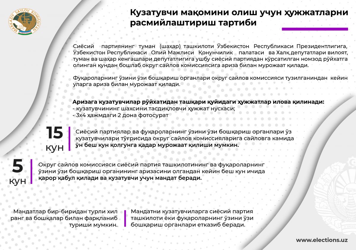 Сайловда хорижий (халқаро) кузатувчи сифатида иштирок этиш учун таклиф этилган, шунингдек бундай истакни изҳор этган хорижий давлатлар, халқаро ташкилотлар ўз кузатувчиларининг рўйхати, шахсини тасдиқловчи ҳужжатлари нусхалари, электрон фото суратлари (jpeg форматда, камида 100 КВ, 600х600рх) ҳамда анкеталарни Ташқи ишлар вазирлигига тақдим қилади.